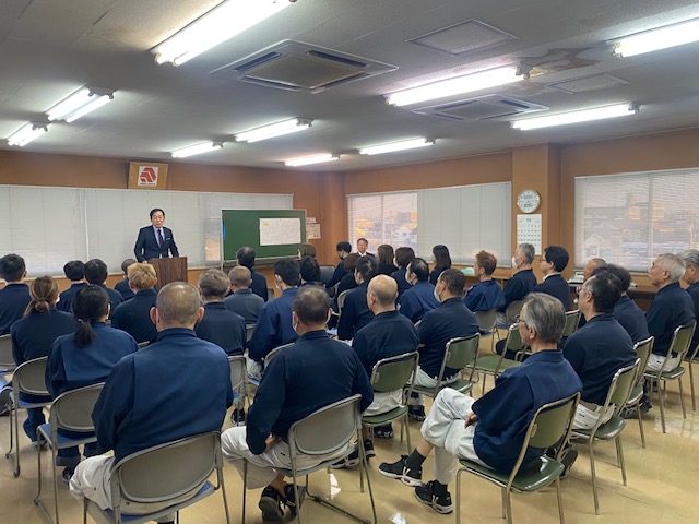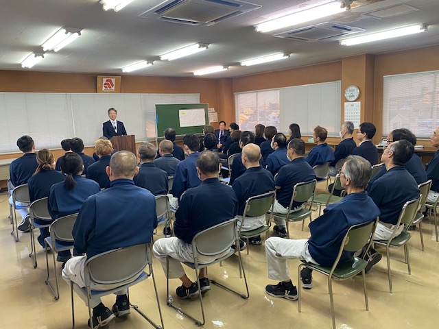 10月29日 ダイナパック社長 齊藤様 と丸中紙工の代表取締役会長になる青木様がご挨拶されました。